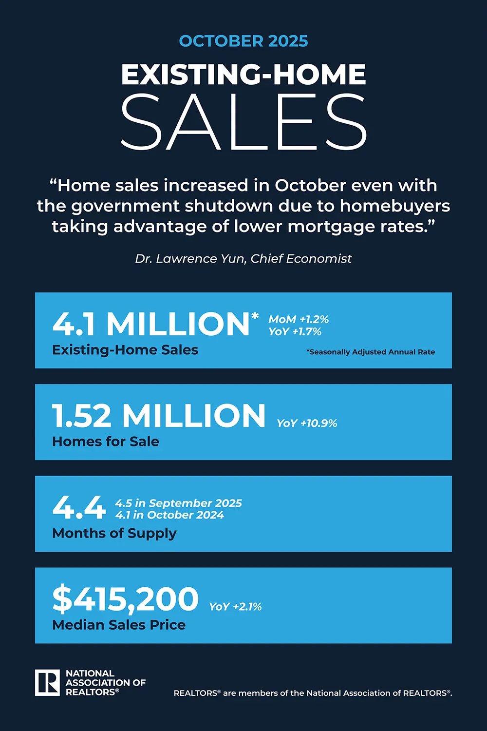“Home sales increased in October even with the government shutdown due to homebuyers taking advantage of lower mortgage rates. Improving affordability is bringing more buyers into the market.”